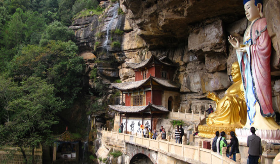 ? ? 剑川石钟山石窟位于云南大理白族自治州剑川县内,始凿于南诏国王劝丰佑时代,终于段氏大理国中期,为相沿近300年之久的古代白族人民的石窟艺术。因地处石宝山脉,又称作石宝山石窟,享有“西南敦煌”的美誉,1962年被国务院列为全国重点文物?;さノ?。石窟分布在沙登村、石钟寺和狮子关三个区。沙登村石刻在古道两旁的山石上,有石刻四处,分别雕出弥勒佛,阿弥陀佛、天王等。石窟分布于石钟寺(8窟)、狮子关(5窟)、沙登村(4窟)三区,共有17窟139躯造像,为南诏、大理同遗刻,间有少数元、明造像??吣谠煜裼斜局鳌⒎稹⑵腥?、明王、天王、头陀僧等,具有浓厚的密宗色彩。少数洞窟如"华严三圣"窟、"维摩诰说法"窟,反映了内地显宗的影响。它既是南诏艺术珍品,也是富贵的民族史料,为后人研究南诏的政治、军事、文化,以至服饰、风尚等都提供了宝贵的资料。