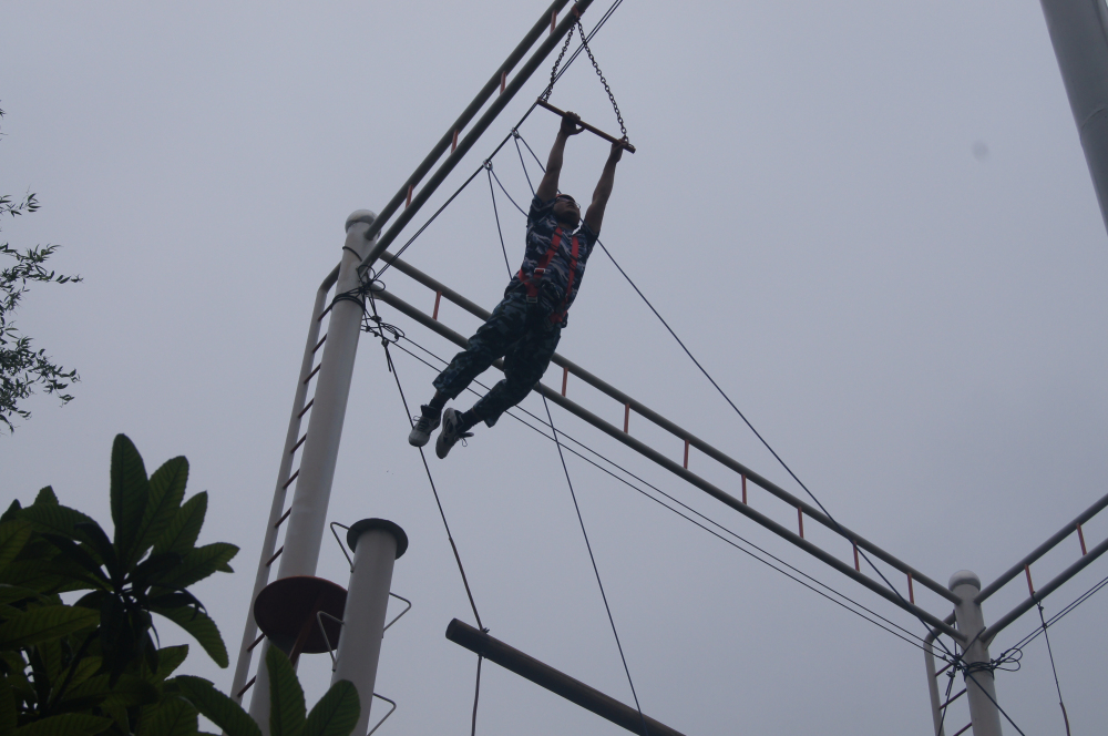 ? ? ? ?接下来的项目【巨人脚步】,七人一组,脚踏长板,手提长绳,齐心协力共同走过一段距离,这个项目让我们体会到只有步调一致,齐心协力才能顺利、高效地完成团队任务,实现企业的目标。下午的【高空飞翔】属于高空类个人心理挑战项目,独自立于8米高的杆上,通过跳跃抓住正前方的横杆,整个过程需独立完成。这个过程需要极强的自信心与勇气,且须克服心理压力,这个项目让大家懂得了换位思考,感受到不同职位上的真实处境,体会到工作中有些事情并不像我们看到的那样简单,只有当你处于相应位置时才能感受到它的艰辛。
