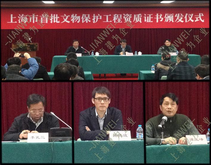 ? ? ? ?2012年3月12日,上海市文物局在“三山会馆”组织了上海市首批文物保护工程资质颁证仪式。全市取得首批文物保护工程资质的企业共55家,其中设计企业15家,施工企业29家,监理企业11家。我司郭伟民董事长和技术咨询部刘超经理出席此次活动,并领取了文物保护工程施工资质证书。