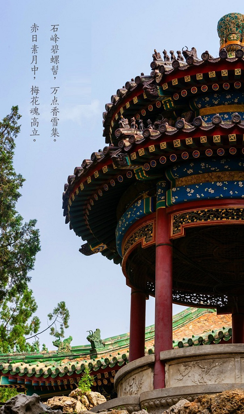 ? ? ? ?碧螺亭平面呈梅花形,五瓣形须弥座,五柱五脊,重檐攒尖顶,上层覆翡翠绿琉璃瓦,下层覆孔雀蓝琉璃瓦,上下层均以紫晶色琉璃瓦剪边,上安束腰蓝底白色冰梅宝顶。每层五条垂脊,分为五个坡面,亦仿梅之意。亭柱间围成弧形的白石栏板上雕刻各种梅花纹图案。柱檐下安装透雕折枝梅花纹的倒挂楣子。亭内顶棚为贴雕精细的梅花图案天花。上下檐额枋彩画为点金加彩折枝梅花纹苏式彩画。亭前檐下悬乾隆御笔“碧螺”匾。亭南架一石桥,通萃赏楼二层,东西有石阶,可通山下。碧螺亭形体别致,色彩丰富协调,是极为罕见的亭式建筑。